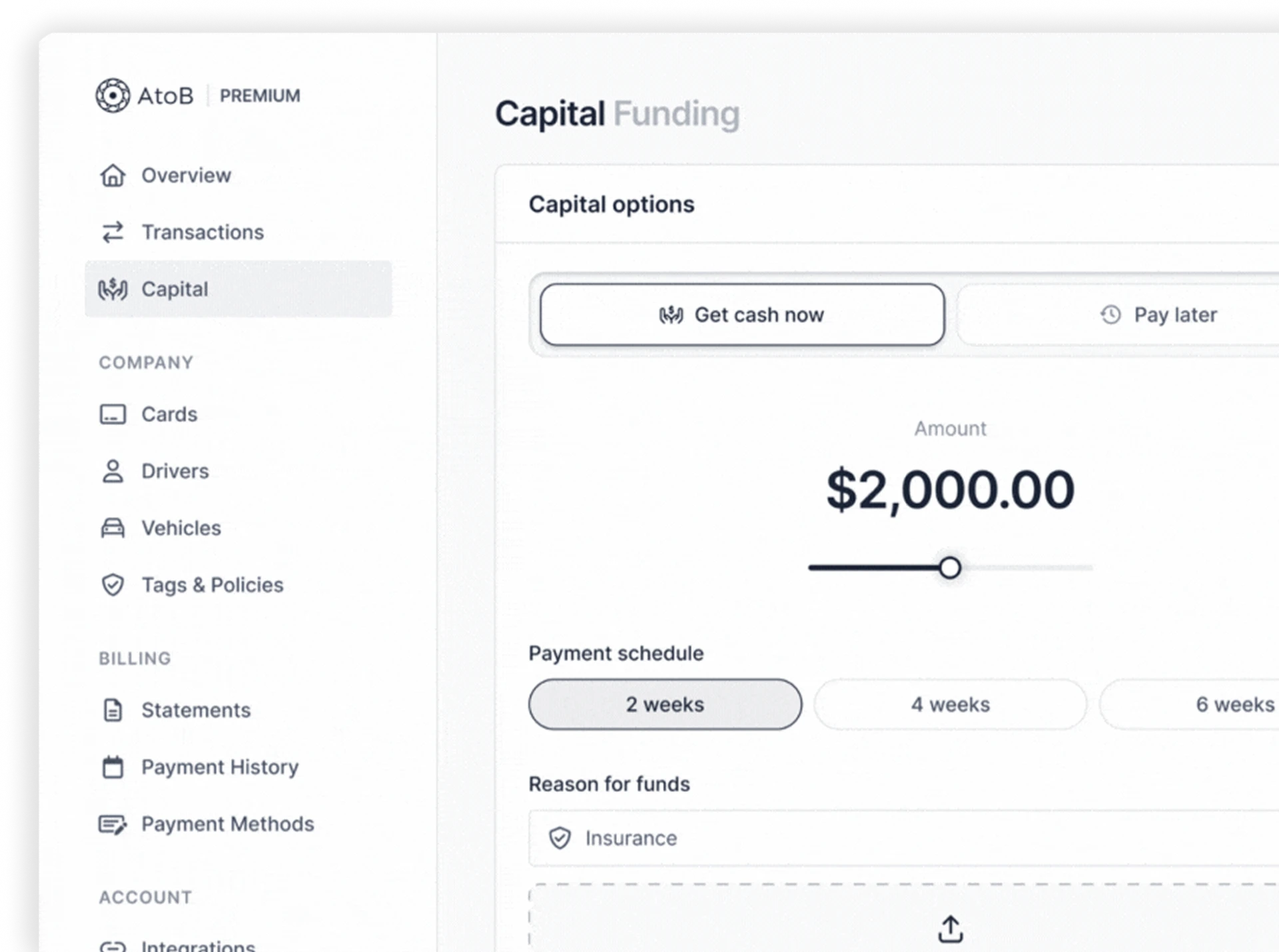 Short-term funding built specifically for fleets: trip advances, capital loans, and flexible pay-over-time options.