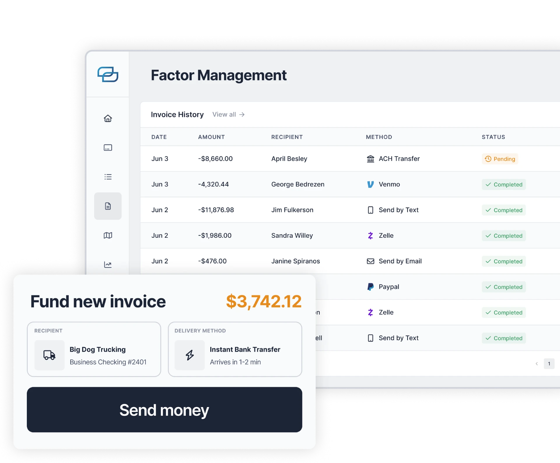 We instantly move money to carrier bank accounts or driver debit cards 24/7, beating traditional wire speeds and costs.